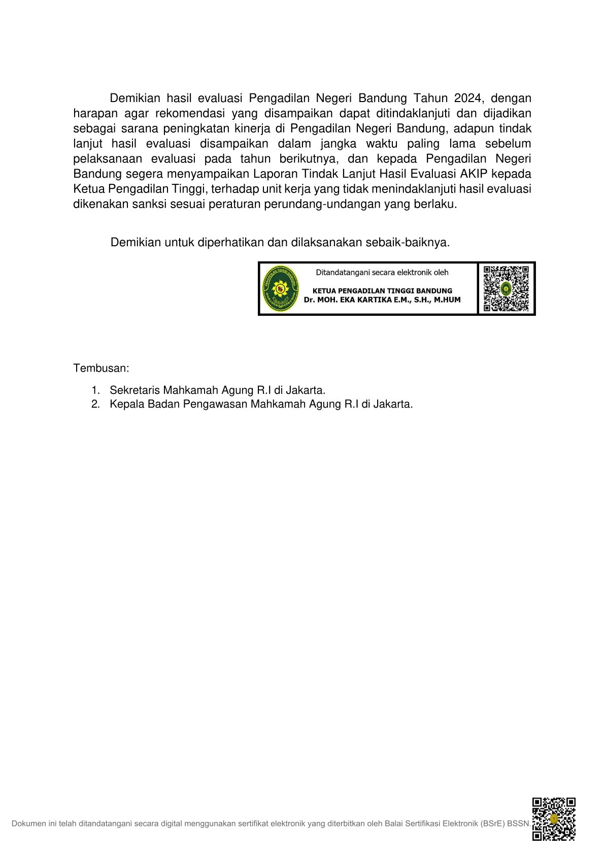 Laporan Hasil Evaluasi Akuntabilitas Kinerja Pengadilan Negeri Bandung Tahun 2024, telah dikirim dari Pengadilan Tinggi Bandung, untuk ditindaklanjuti dan dijadikan sebagai sarana peningkatan kinerja di Pengadilan Negeri Bandung.