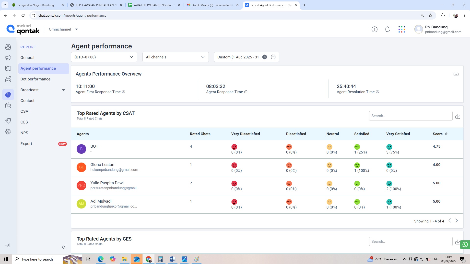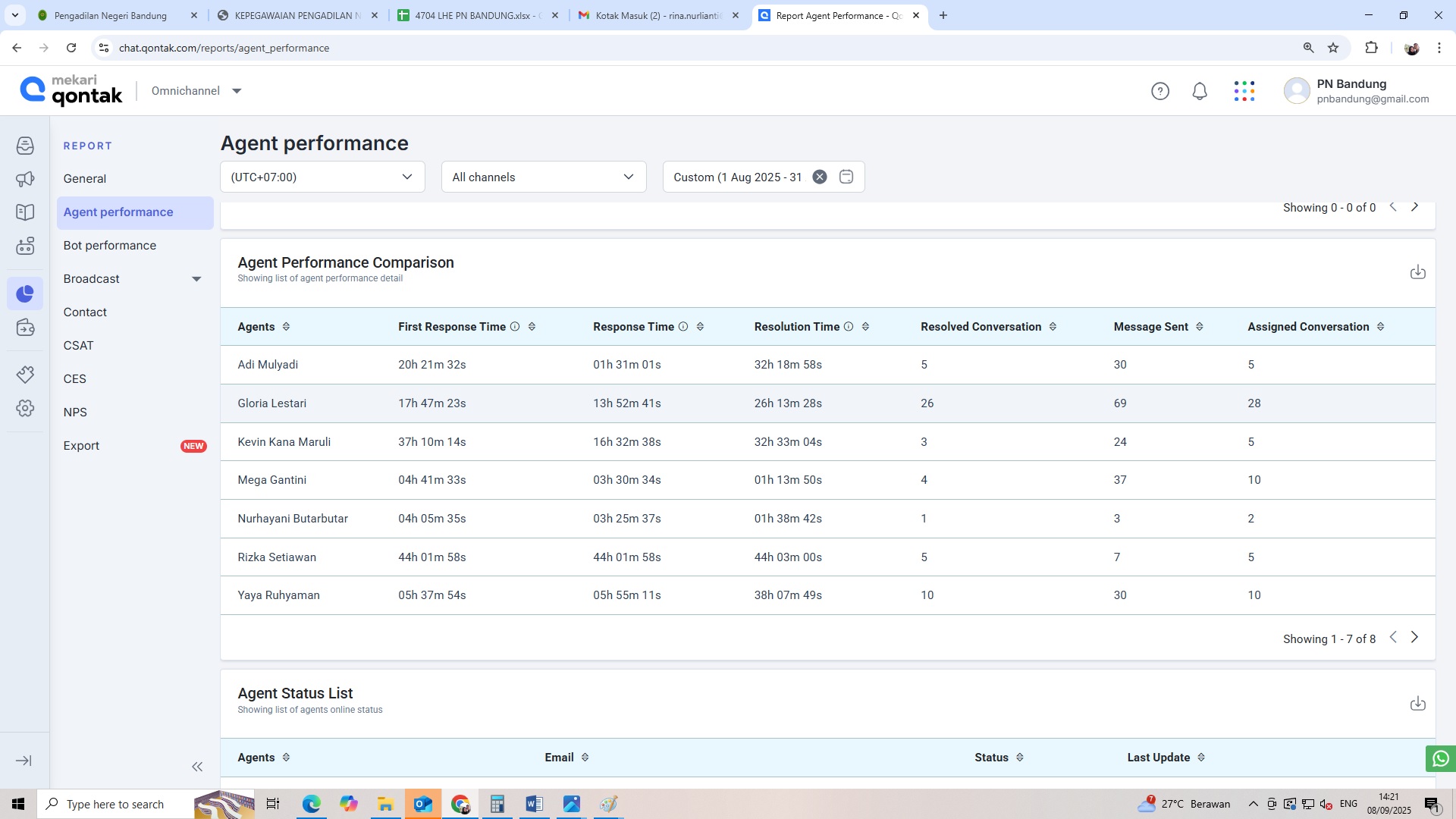 Pada hari Senin, tanggal 8 September 2025 telah dilaksanakan Monev Aplikasi Tanya Dilan Periode Bulan Agustus 2025, dengan total chat sebanyak 292 conversation.