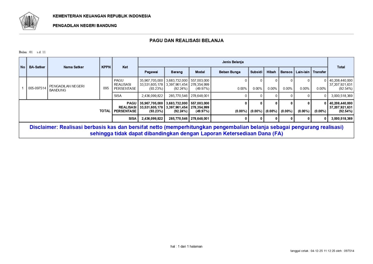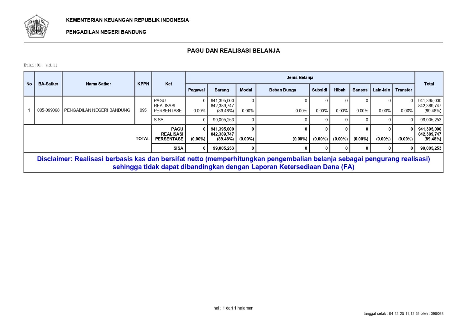Laporan Realisasi Anggaran 01 dan 03 Periode Januari – November 2025 telah diupload pada Website.