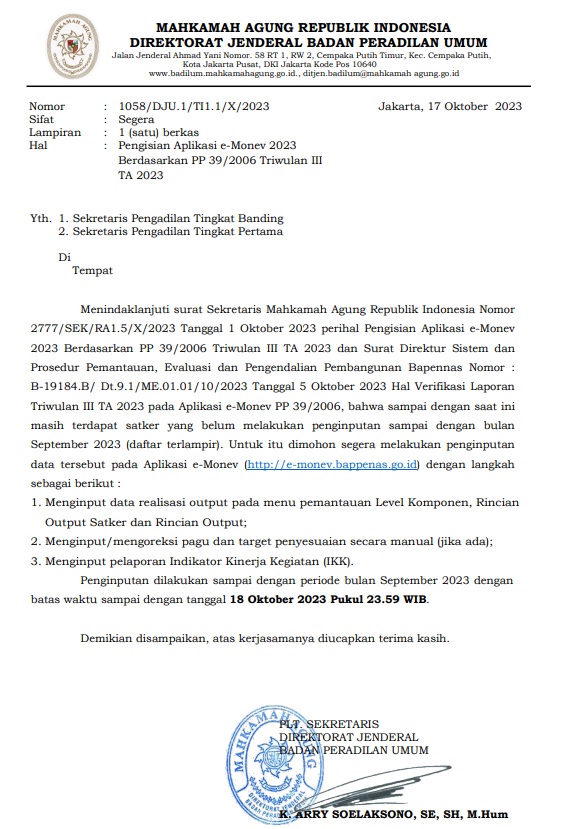 Bandung 17 Oktober 2023, Ibu Riyanti Andriyasari, SKom telah melaksanakan pengisian e Monev Pengadilan Negeri Bandung periode September 2023 sesuai surat :