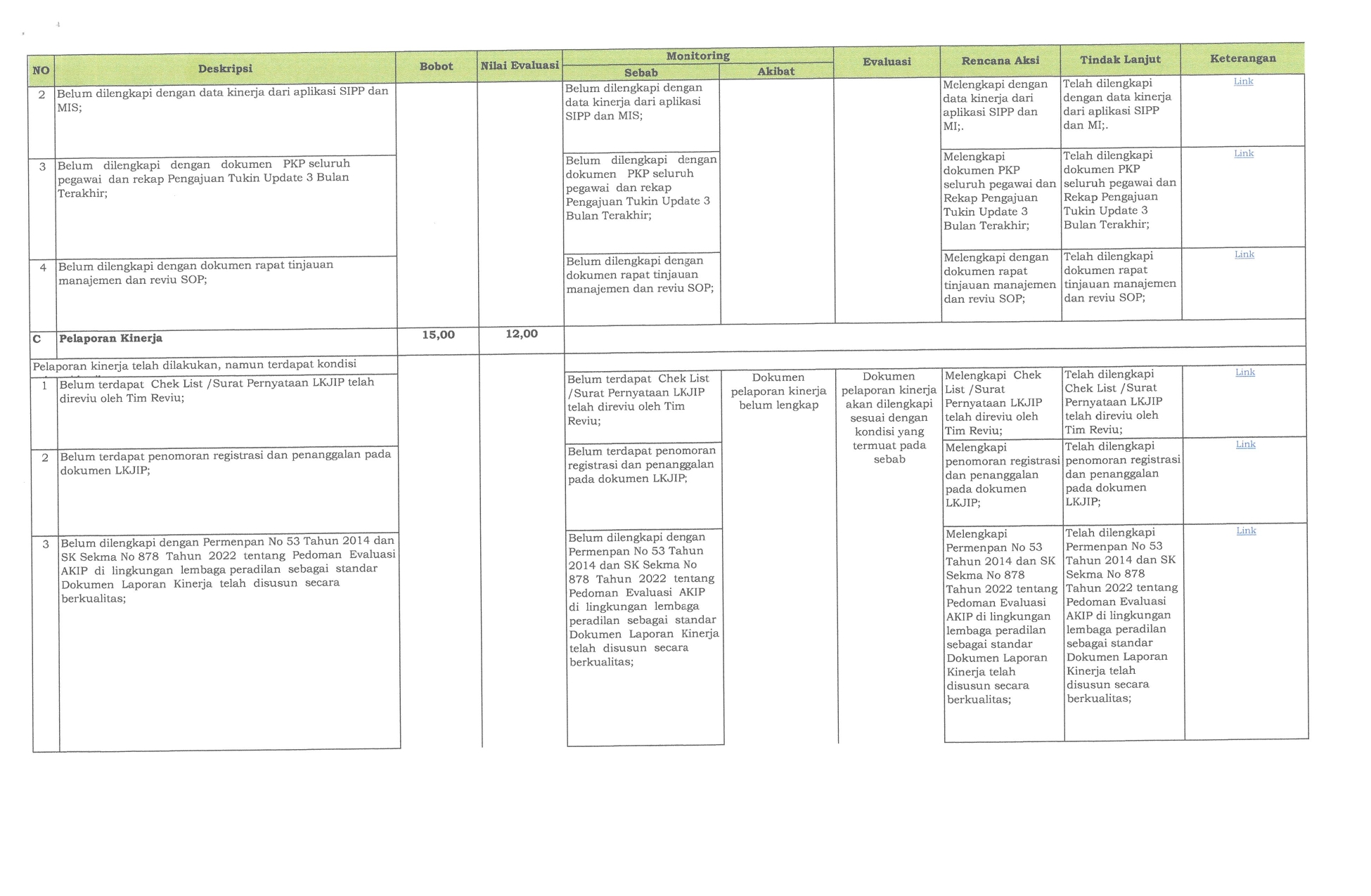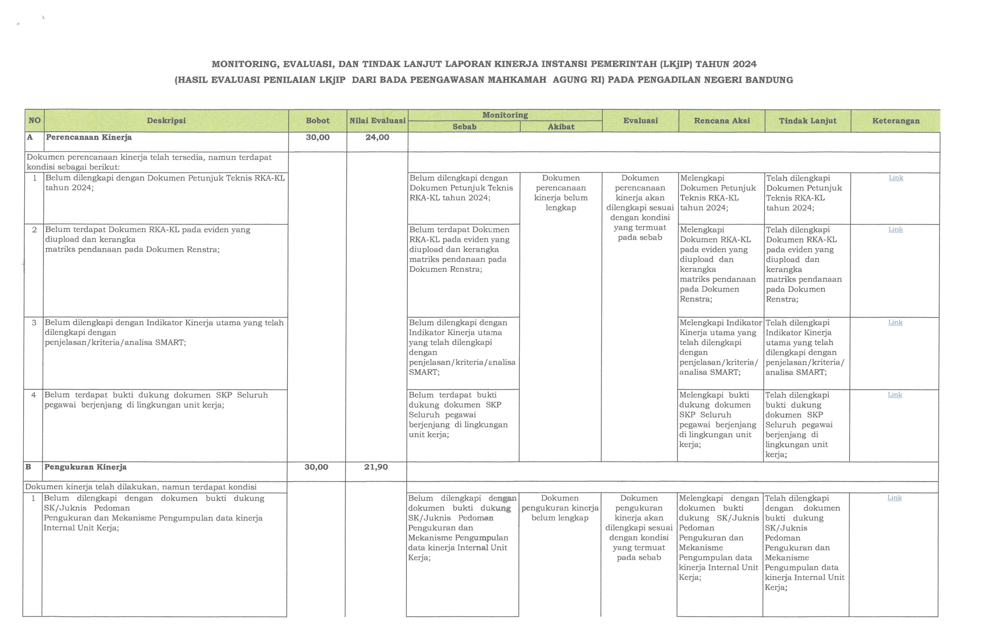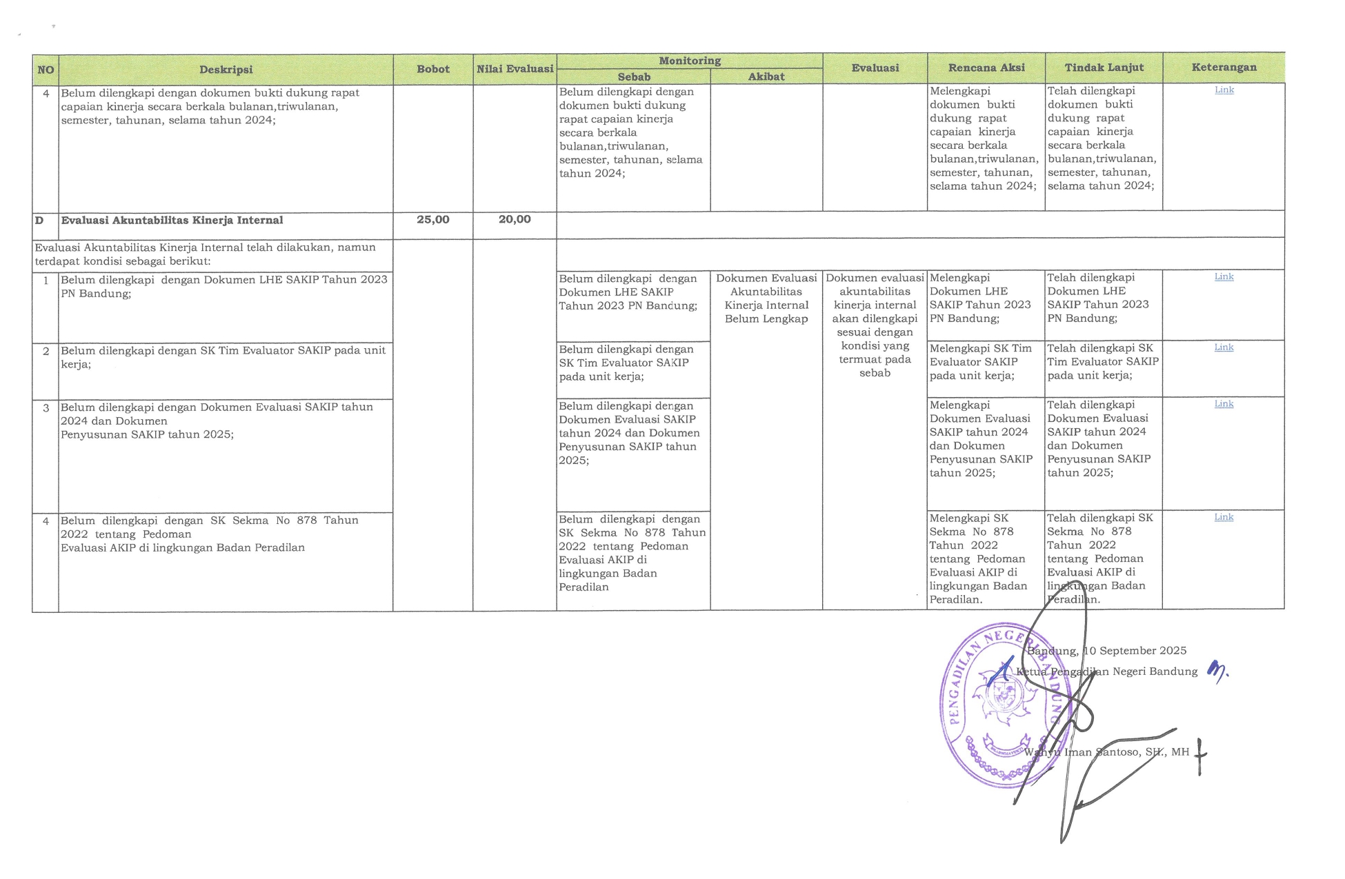 Sehubungan dengan telah dilakukannya pemeriksaan dokumen SAKIP Pengadilan Negeri Bandung pada aplikasi e-Semar dan Surat Ketua Pengadilan Tinggi Bandung Nomor : 4704/W11-U/RA1.1/VII/2025, tanggal 30 Juli 2025, perihal Laporan Hasil Evaluasi Akuntabilitas Kinerja, telah dikirim kan ke Penagdilan Tinggi Bandung mengenai Tindak Lanjut hasil evaluasi Akuntabilitas Kinerja Instansi Pemerintah pada Pengadilan Negeri Bandung.