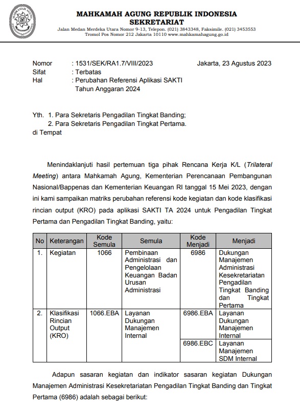 Bandung, 26 September 2023 Pengadilan Negeri Bandung melaksanakan perubahan Referensi Sakti Dipa 01 Tahun 2024 Kode Kegiatan 1066 menjadi 6986