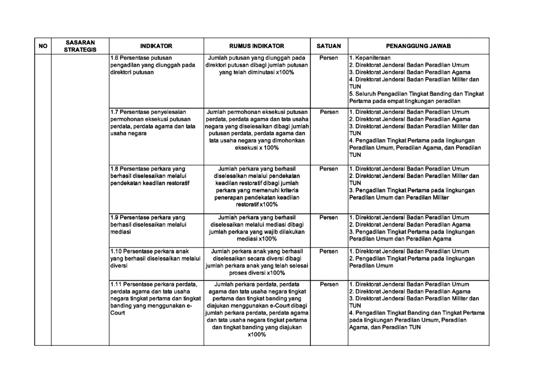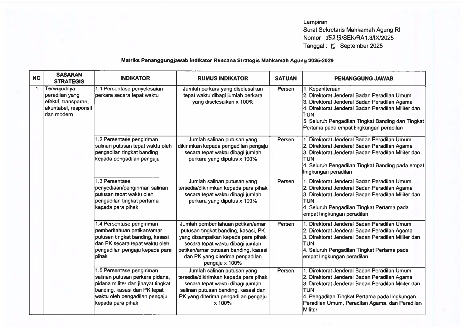 Mahkamah Agung Republik Indonesia telah menyampaikan Renstra Tahun 2025-2029 dengan surat Nomor : 15213/SEK/RA1.3/IX/2025, tanggal 16 September 2025, dengan ketentuan sebagai berikut :