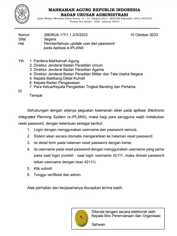 Bandung, 11 Oktober 2023 Kasub Bag PTIP melaksanakan reset Password I Plans berdasarkan surat Ka Biro Perencanaan dan Organisasi