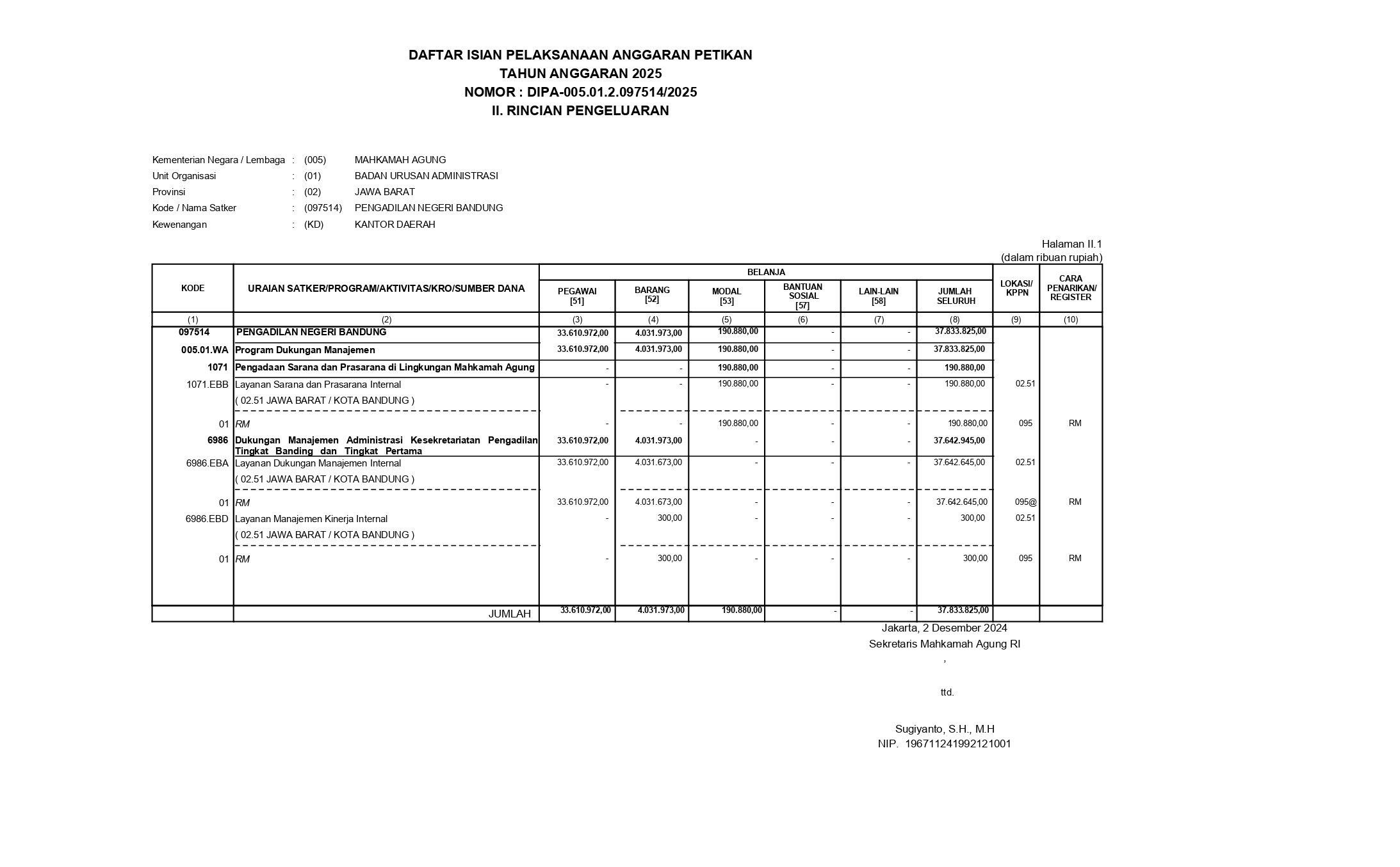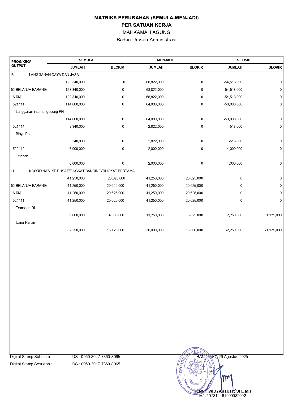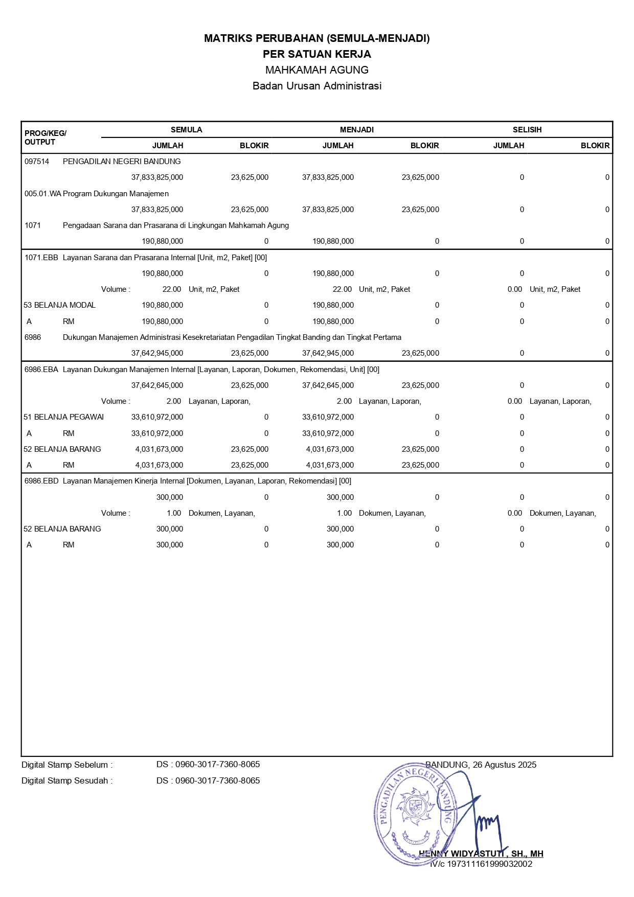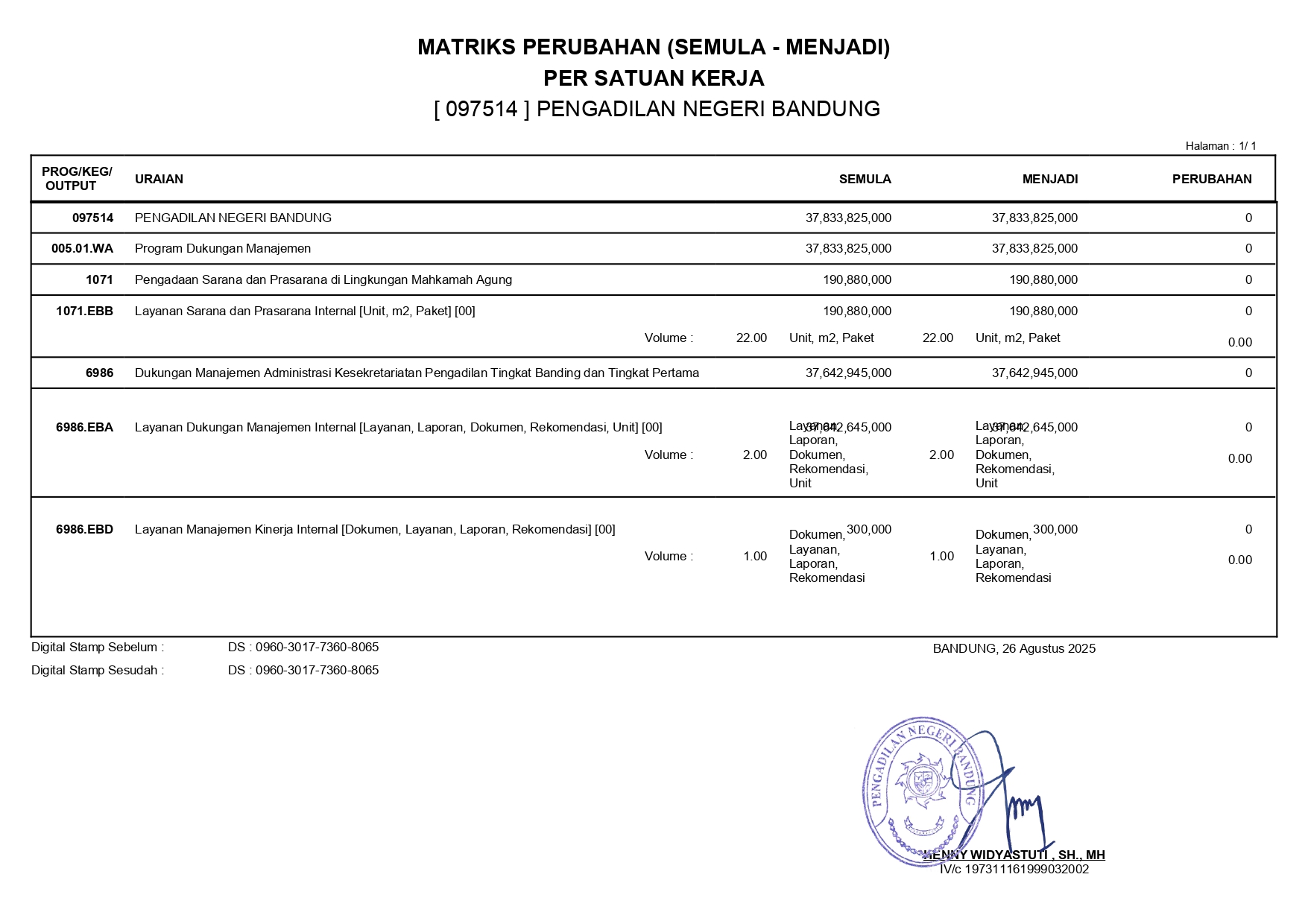 Pada tanggal 26 Agustus 2025, Pengadilan Negeri Bandung melalui Kuasa Pengguna Anggaran mengirimkan usulan revisi anggaran kepada Kepala Kanwil Ditjen Perbendaharaan Provinsi Jawa Barat, dengan rincian sebagai berikut :