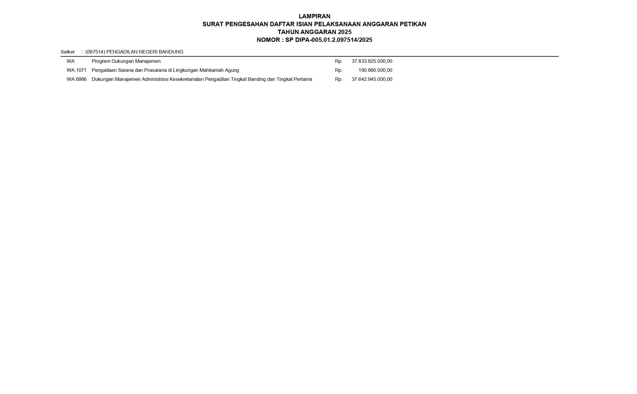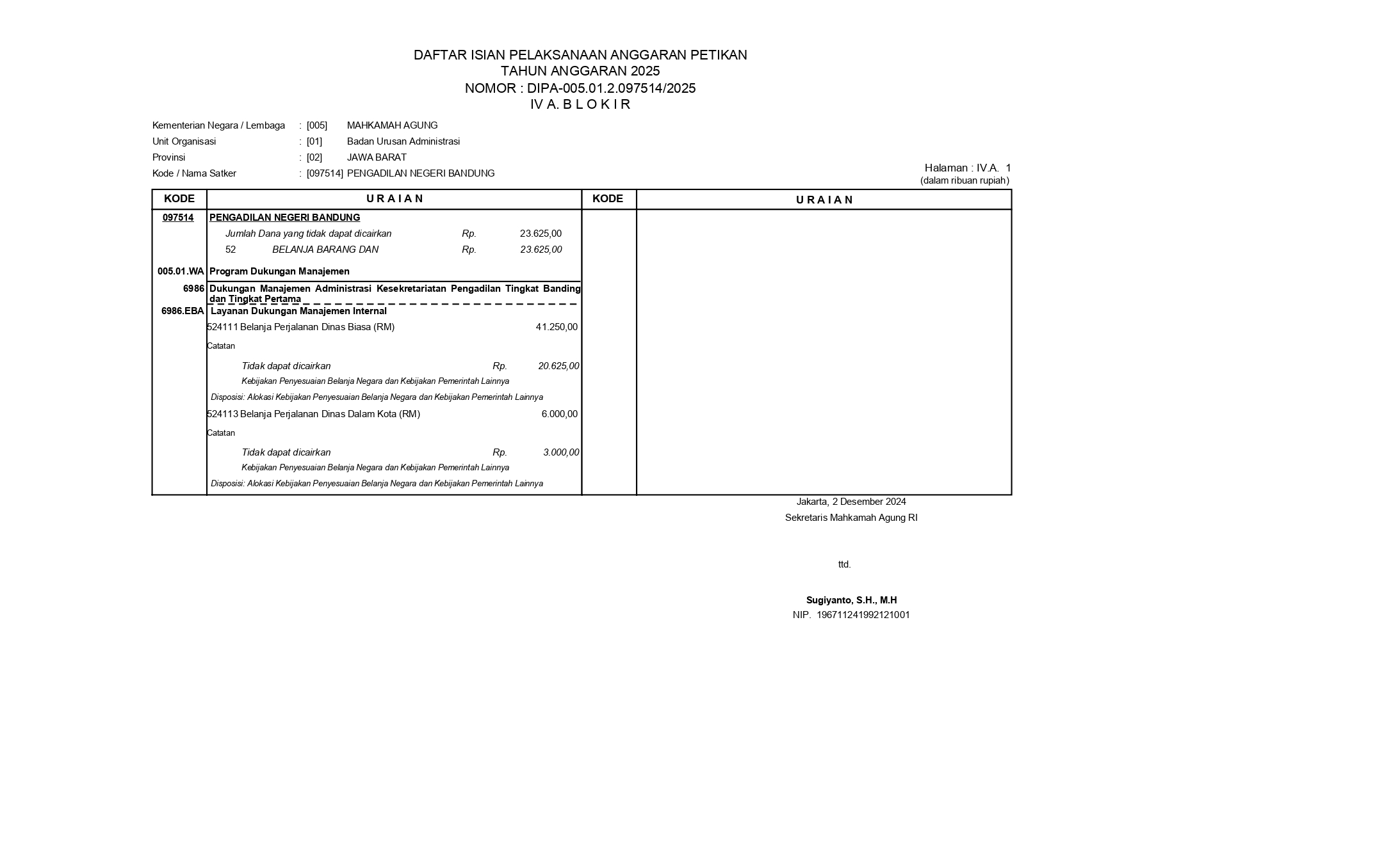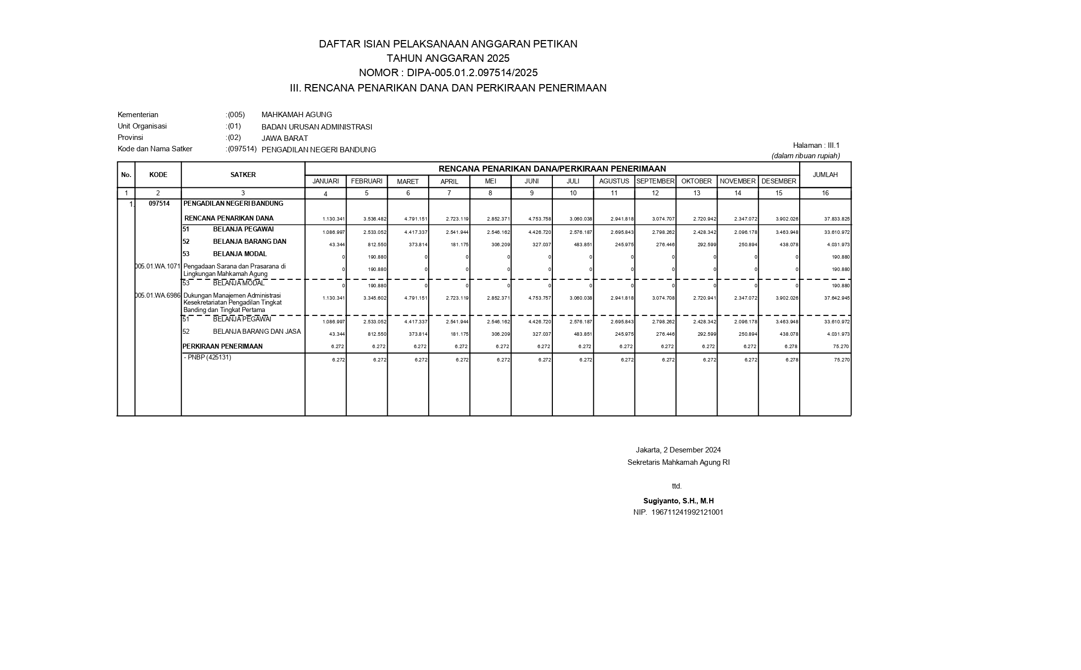 Pada tanggal 26 Agustus 2025, Pengadilan Negeri Bandung melalui Kuasa Pengguna Anggaran mengirimkan usulan revisi anggaran kepada Kepala Kanwil Ditjen Perbendaharaan Provinsi Jawa Barat, dengan rincian sebagai berikut :