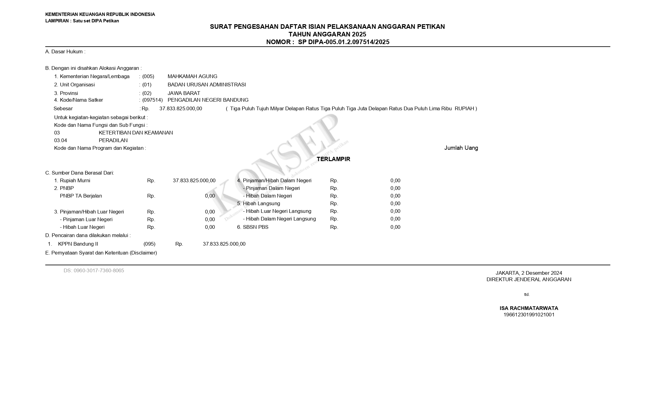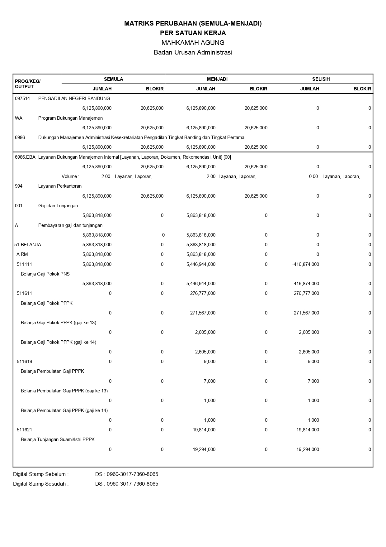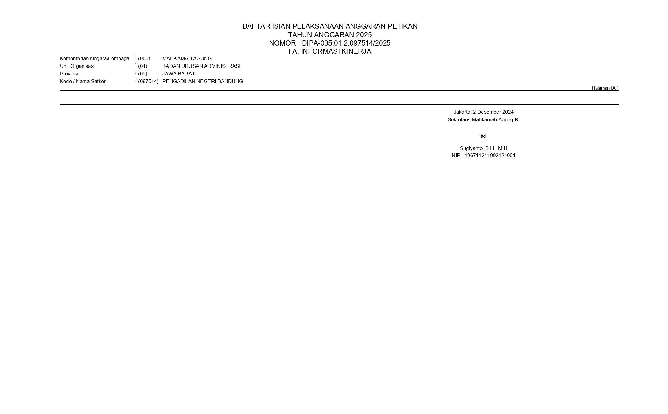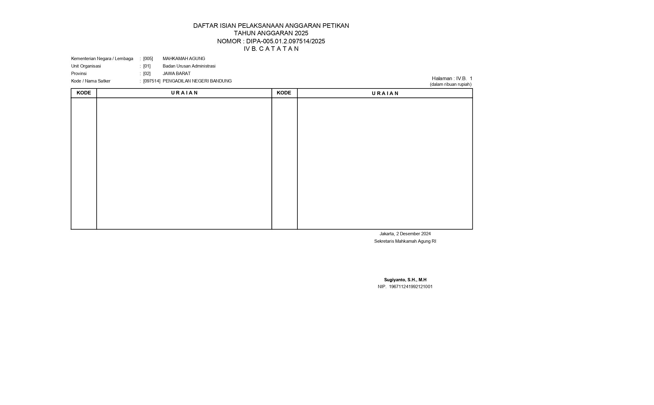 Pada tanggal 26 Agustus 2025, Pengadilan Negeri Bandung melalui Kuasa Pengguna Anggaran mengirimkan usulan revisi anggaran kepada Kepala Kanwil Ditjen Perbendaharaan Provinsi Jawa Barat, dengan rincian sebagai berikut :