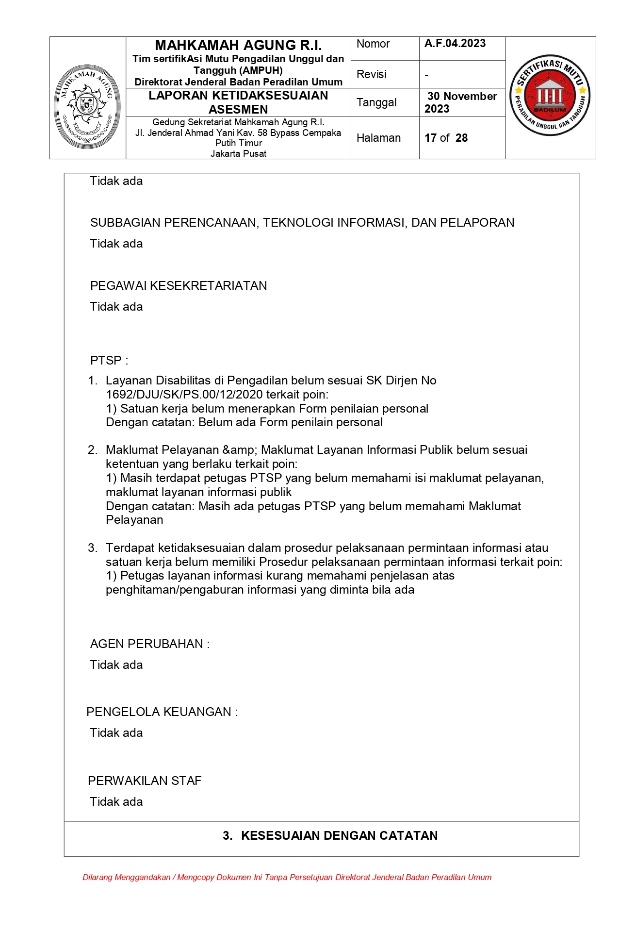Sub Bagian Perencanaan, Teknologi Informasi, dan Pelaporan tidak ada temuan AMPUH Badilum