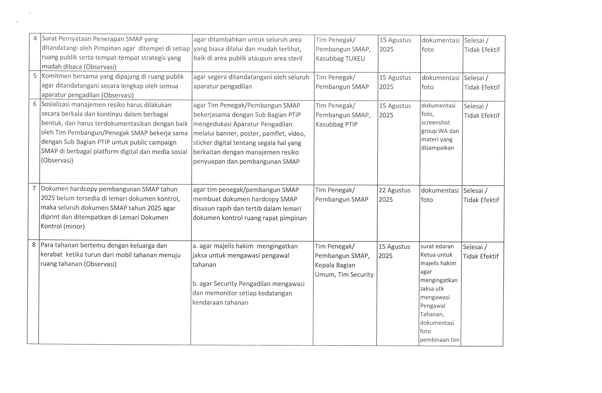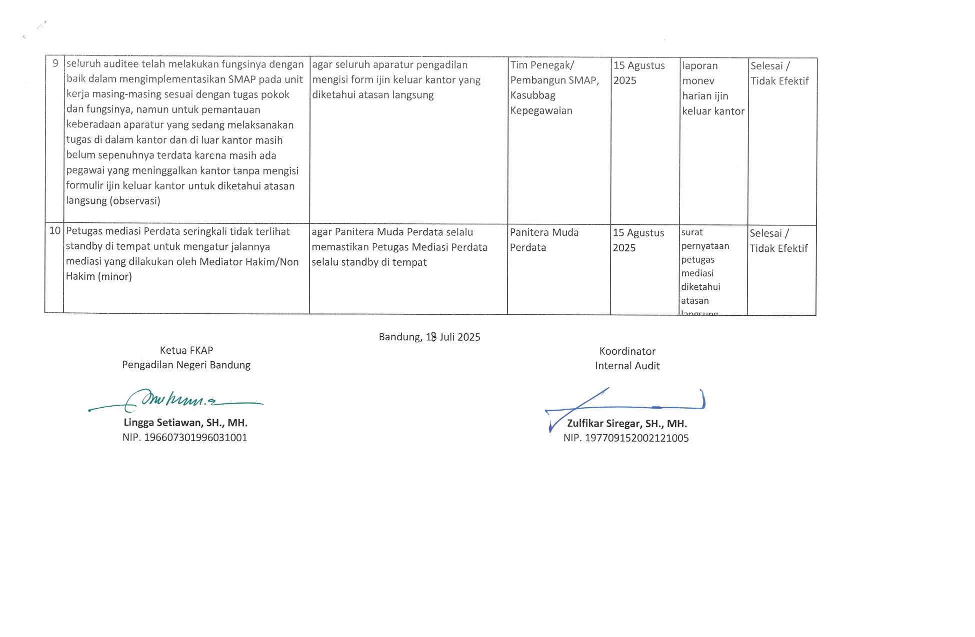 Tim Audit Internal SMAP telah membuat formulir ketidaksesuaian Implementasi SMAP pada pengadilan Negeri Bandung, untuk selanjutnya ditindaklanjuti oleh PIC nya masing-masing temuan. Eviden tindak lanjut dapat di upload pada link https://drive.google.com/drive/folders/1zDWYD8j8NMlALMzZeJADKEjO_meZSVB3