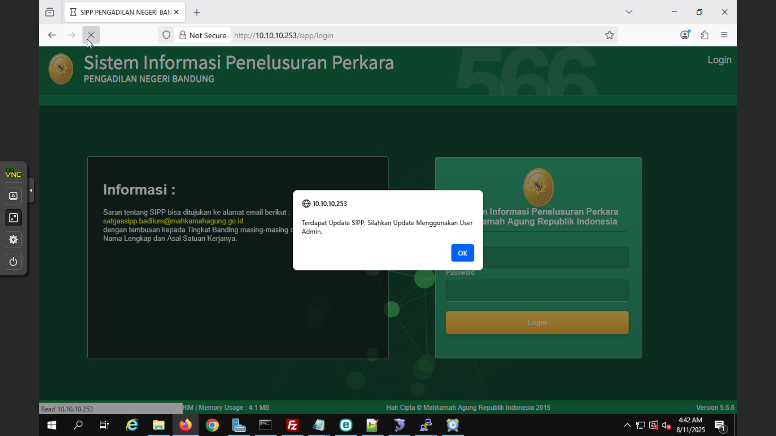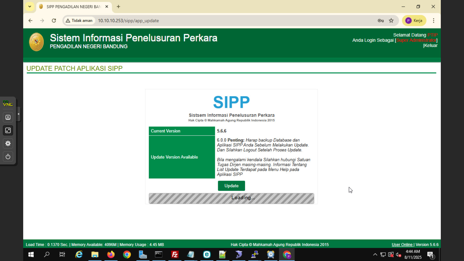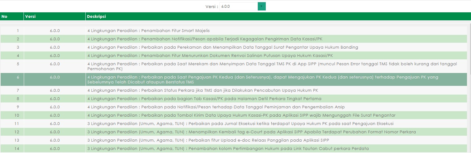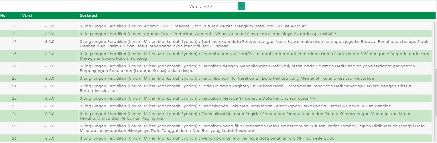 Pengadilan Negeri Bandung telah melaksanakan Update SIPP Versi 6.0, sesuai surat dari Direktur Jenderal Badan Peradilan Umum Nomor 1476/DJU/TI1.1.1/VIII/2025, tanggal 8 Agustus 2025 perihal Pemantauan Pembaruan Aplikasi SIPP Tingkat Pertama Versi 6.0.0.